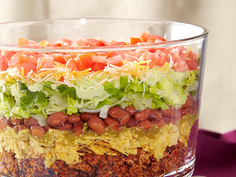This gorgeous and colorful 8-layer taco salad recipe is made healthier by using ground turkey in place of beef, adding Greek yogurt and bumping up the amount of vegetables. Serve this salad in a clear glass bowl and you’ll have an eye-catching party-worthy dinner or potluck side in just 30 minutes.