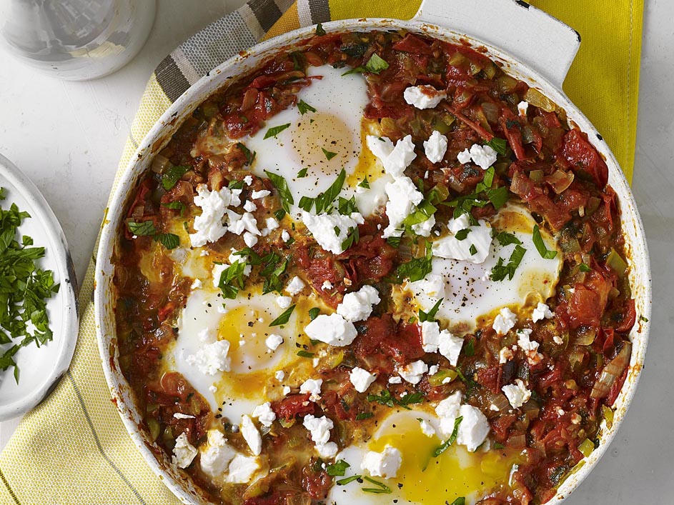 This popular Israeli breakfast or brunch skillet recipe features eggs cooked on a bed of roasted tomato sauce. Serve with warm crusty bread and hot sauce.