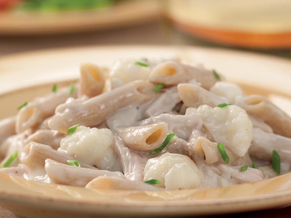 3. Stir the sauce into the drained pasta and cauliflower. Serve sprinkled with chives (or scallion greens).