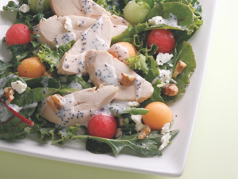 - Whisk sour cream, vinegar, sugar, poppy seeds, salt and pepper in a large bowl until smooth. Reserve 1/4 cup of the dressing in a small bowl. Add the mixed greens to the large bowl and toss to coat. Divide among 4 plates and top with chicken, melon, walnuts and feta. Drizzle each portion with 1 tablespoon of the reserved dressing.