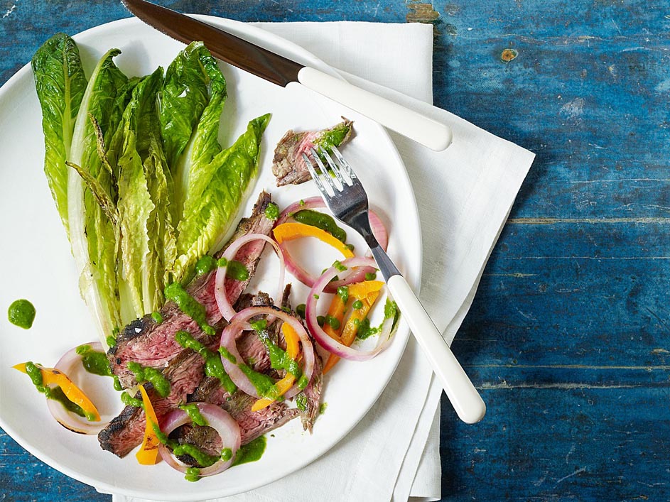 - Cut each heart (or head) of romaine in half lengthwise, leaving the root end intact. Brush lettuce, bell pepper and onion with the remaining 1 tablespoon oil. Sprinkle with 1/4 teaspoon salt. Sprinkle the steak with remaining 1/4 teaspoon salt. Let the dressing come to room temperature if necessary while you grill.