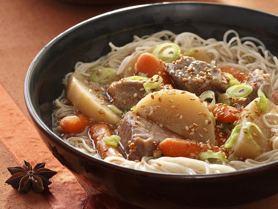 - Place carrots and turnips in the bottom and up the sides of a 4-quart or larger slow cooker. Top with pork and scallion whites. Bring broth, water, soy sauce, sherry, brown sugar, ginger, vinegar, chile-garlic sauce to taste and garlic to a simmer in a medium saucepan over medium-high heat. Pour over the pork and vegetables. Nestle star anise pod (or aniseed) and cinnamon stick into the stew. Cover and cook until the pork and vegetables are tender, 3 to 3 1/2 hours on high or 5 1/2 to 6 hours on low.