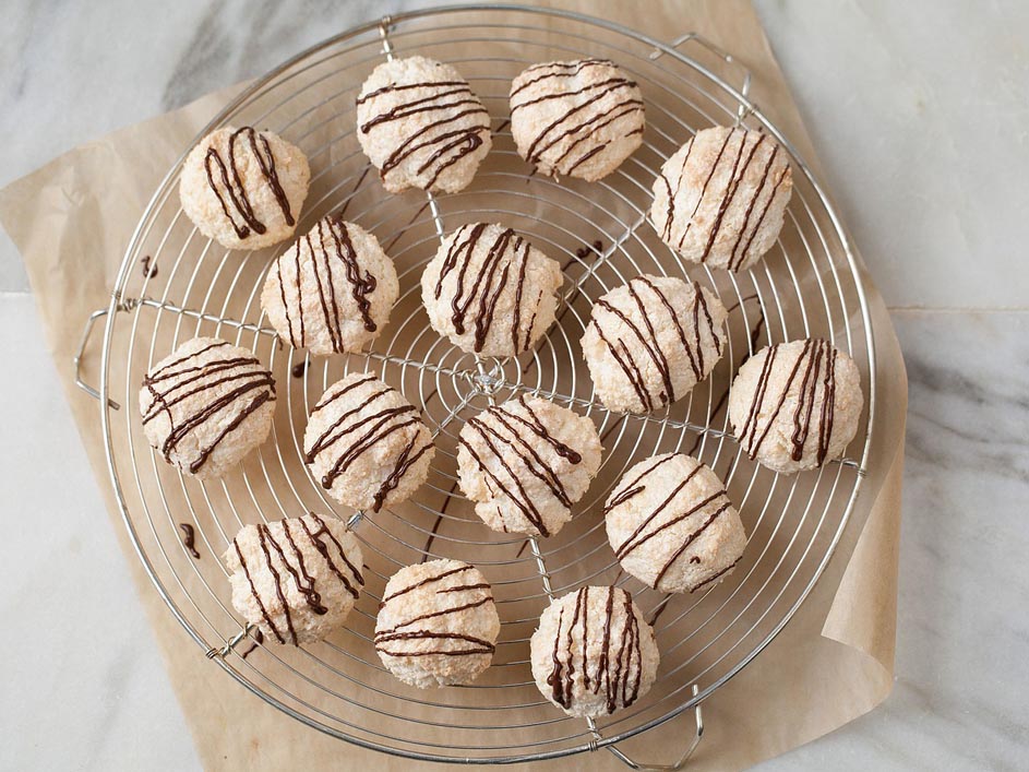 These airy coconut cookies get an upgrade with a simple dark chocolate drizzle in this healthy dessert recipe.
