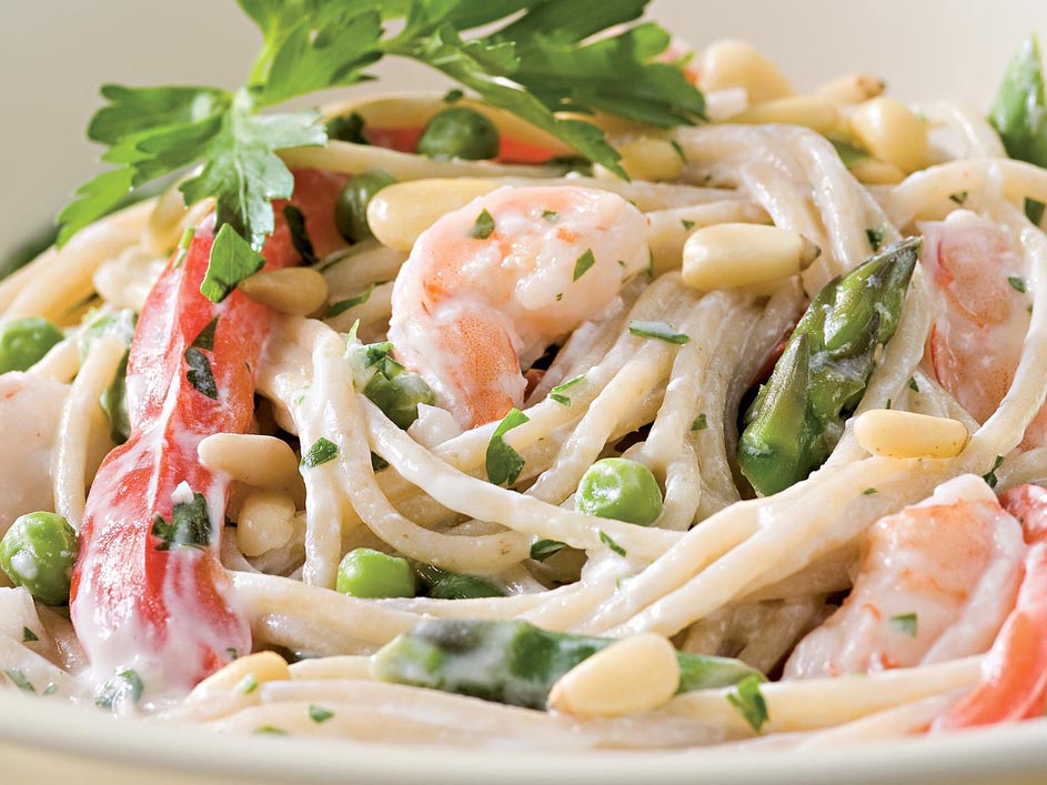 Toss a garlicky, Middle Eastern-inspired yogurt sauce with pasta, shrimp, asparagus, peas and red bell pepper for a fresh, satisfying summer meal. Serve with: Slices of cucumber and tomato tossed with lemon juice and olive oil.