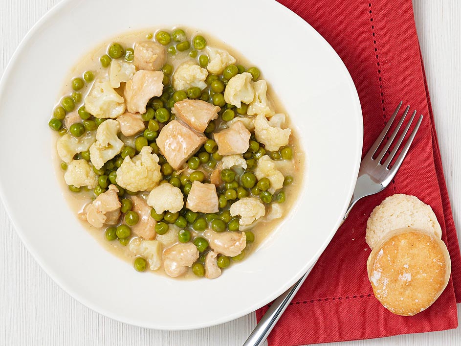 This cheesy, saucy one-pot pea and chicken stew reminds us of the filling in chicken potpie. While it tastes rich and comforting, it has plenty of peas and cauliflower, too, so you get lots of veggies. Serve this creamy healthy pea and chicken stew recipe with biscuits or over brown rice.