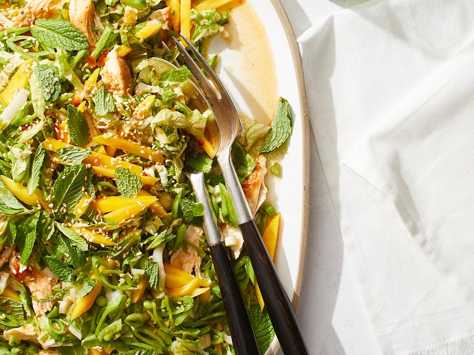 - Whisk juice, vinegar, soy sauce, sesame oil and sambal oelek (if using) in a large bowl. Add cabbage, peas, chicken, mango, mint and scallions; toss gently to coat. Serve the salad sprinkled with sesame seeds.