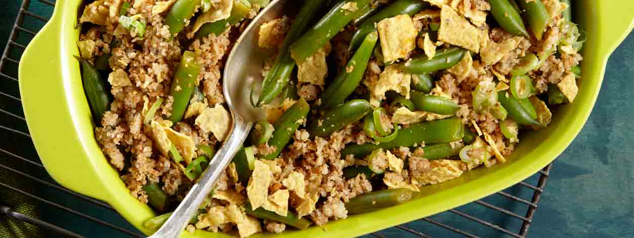 Topped with super crunchy panko breadcrumbs, crushed tortilla chips and cheese, this spicy green bean casserole isn’t your typical side dish. In fact, we’ll bet you’ve never enjoyed green beans this much!