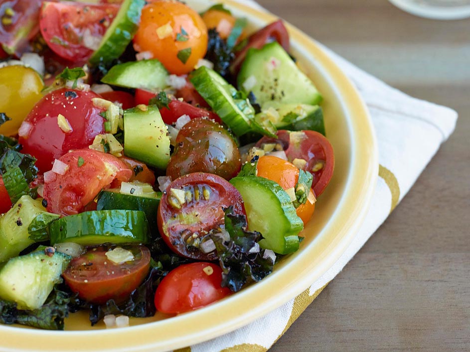 In this cucumber and tomato salad recipe, preserved lemon adds a tangy, salty bite. If you prefer, lemon zest is a good substitute here. Serve this healthy salad as an accompaniment to dishes like grilled lamb or chicken or as a side on a bed of finely julienned purple kale, lightly dressed with more olive oil and lemon juice.