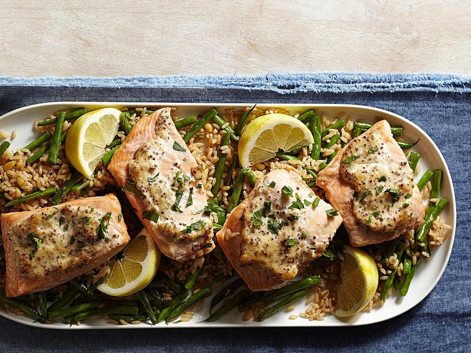 - Sprinkle the salmon with parsley, if desired, and serve with the green bean pilaf and lemon wedges.
