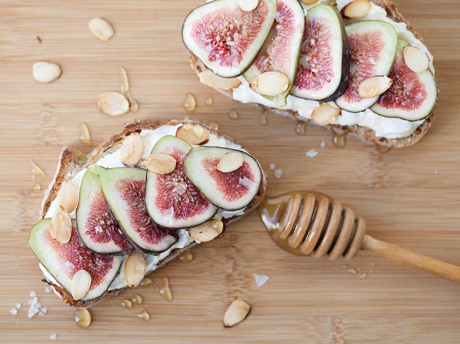 1. Toast bread. Top with ricotta cheese, figs and almonds. Drizzle with honey and sprinkle with sea salt.