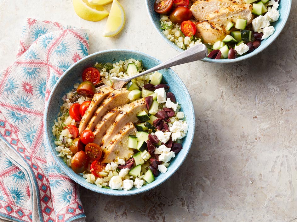 Greek Cauliflower Rice Bowls with Grilled Chicken