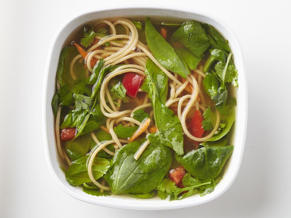 In this very easy Thai noodle soup recipe, just pour hot curry-flavored broth over pasta and veggies. The vegetables keep their crunch and you get a quick, satisfying soup. Feel free to add chicken, shrimp or tofu for an extra bit of protein, if desired.