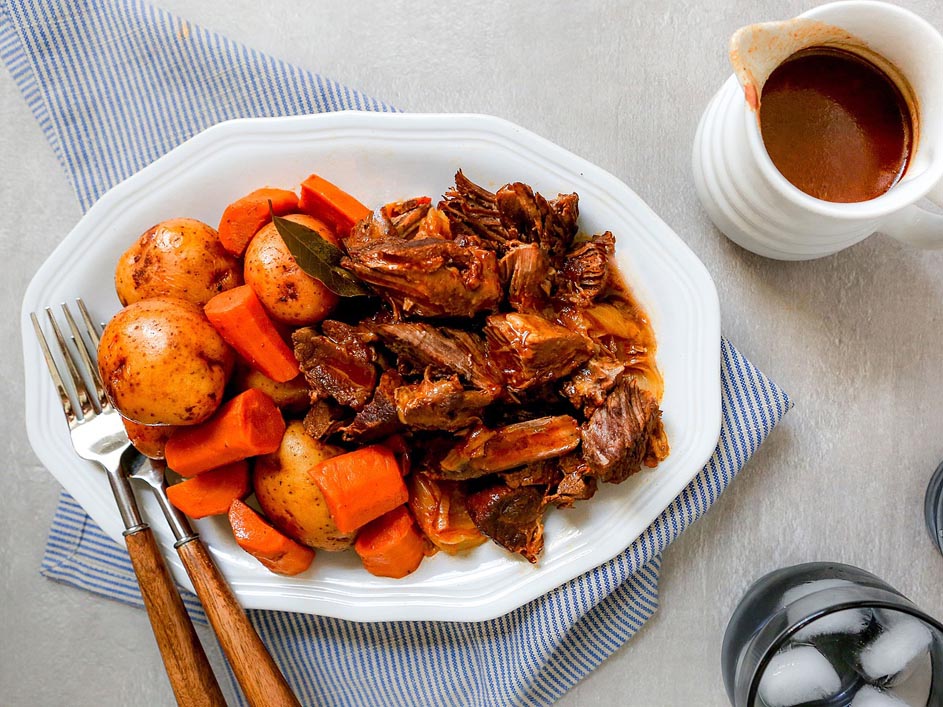 - Transfer the meat and vegetables to a platter and gently shred the meat into large pieces. Skim the fat off the top of the liquid in the pot. Transfer ¼ cup of the liquid to a small bowl and set aside. Return the pot to sauté mode and bring the remaining liquid to a simmer. Whisk together cornstarch and the reserved ¼ cup liquid, then add it the pot. Simmer until the sauce has thickened, 5 to 8 minutes. Stir in vinegar. Serve the sauce over the meat and vegetables.