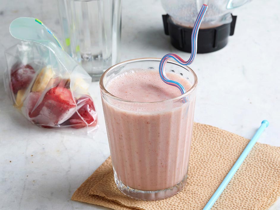 - Place ½ cup strawberries (or other fruit) and ½ cup banana in a sealable plastic sandwich bag. Repeat with the remaining fruit to make 4 more bags. Store in the freezer until ready to use.