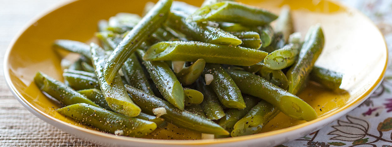 Simply delicious. Freshly cooked green beans in a dressing of olive oil, fresh minced garlic, lemon juice and ground pepper