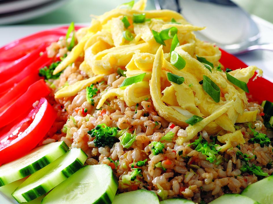- Heat the remaining 1 tablespoon oil over medium-high heat. Add vegetables and cook, stirring, until crisp-tender, about 2 minutes. Add the shallot paste, soy sauce, kecap manis and rice and stir until combined and heated through, about 2 minutes more. Transfer the Nasi Goreng to a platter. Top with the strips of egg and scallions. Arrange tomato and cucumber slices around the edges.