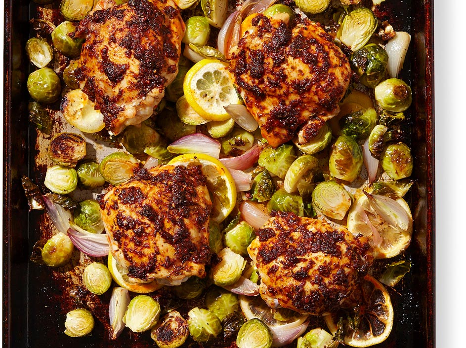 In this chicken recipe, paprika-rubbed chicken thighs are nestled into Brussels sprouts and shallots and roasted on a sheet pan in the oven for an easy dinner. As the chicken thighs roast, the garlicky drippings flavor the Brussels sprouts and shallots. Delicious one-pan cooking! Smoked paprika adds a touch of smoky flavor—look for it at well-stocked supermarkets or in the bulk-spice section at natural-foods markets. Regular paprika can be used in its place, but doesn’t add the hint of smoke.
