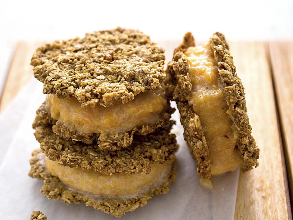 This peach-studded ice cream sandwich recipe is inspired by fruit crumble. The flourless cookies have a flavor reminiscent of the topping on that quintessential summer dessert.