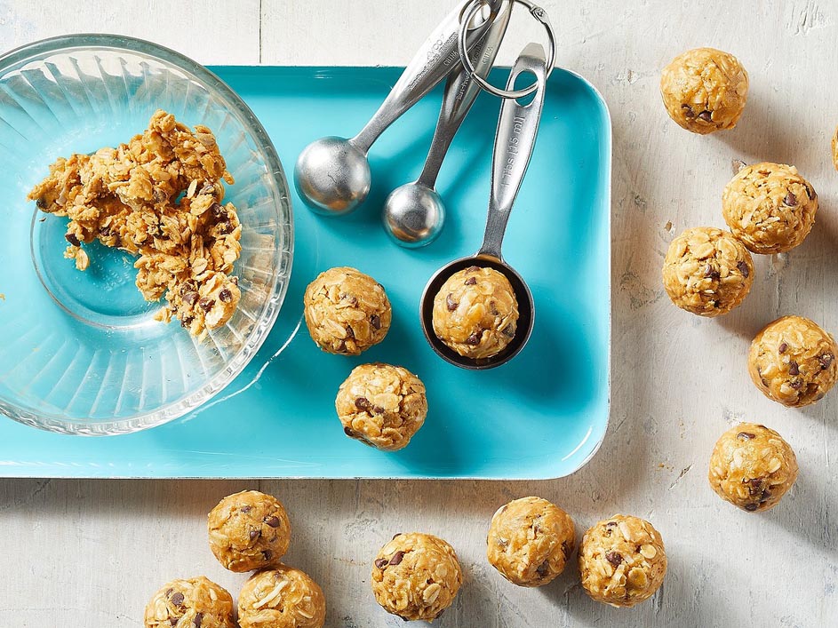 - Combine oats, peanut butter (or other nut butter), honey, chocolate chips and coconut in a medium bowl; stir well. Using a 1-tablespoon measure, roll the mixture into balls.