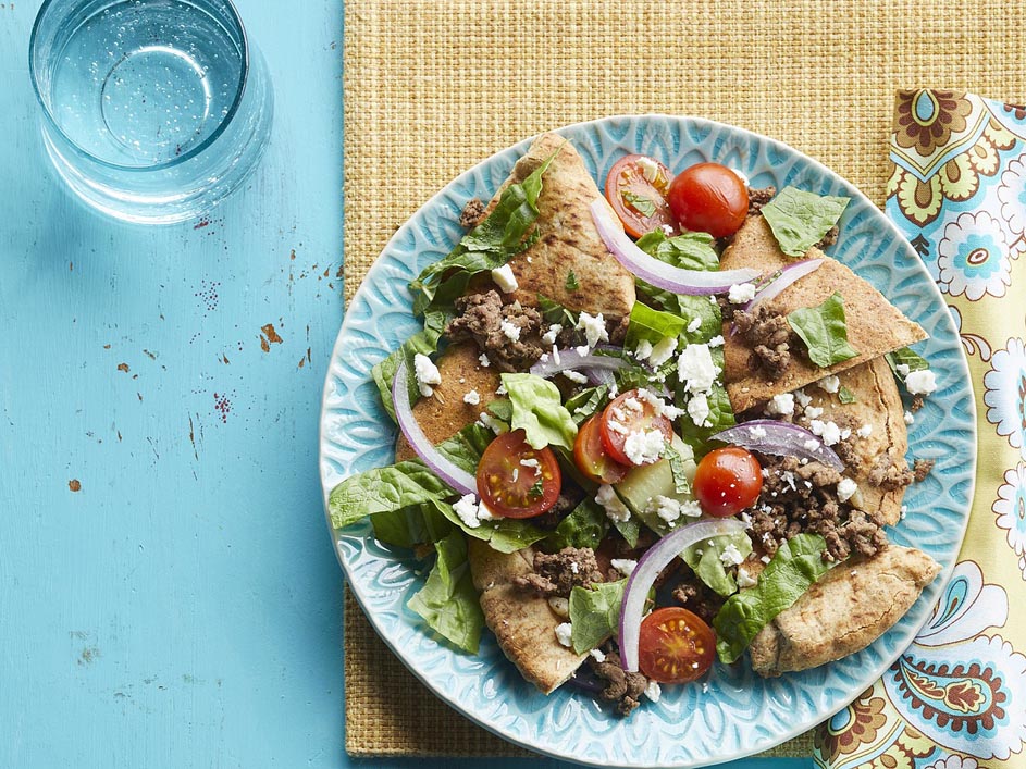 - Divide pita chips among 4 dinner plates. Top with equal portions of the meat, lettuce, tomatoes, feta, mint and onion. Drizzle with the yogurt sauce.