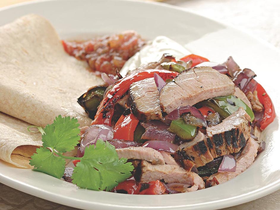 - Thinly slice the pork and chop the onion. Toss the onion, peppers and pork together in a large bowl. Serve the fajita filling in tortillas with sour cream and salsa.