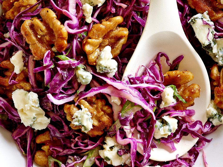 Serve this hearty salad recipe—combining red cabbage, blue cheese and glazed walnuts—as an accompaniment to roast pork or chicken. To slice the cabbage quickly, cut the head into wedges and slice in your food processor. A mandoline is also a great tool for the job.