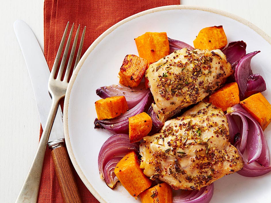 Caramelized sweet potatoes and red onion are the bed for chicken thighs that cook up fast in a very hot oven—perfect for a quick healthy chicken dinner. Serve with a fall salad of mixed greens, sliced apples and blue cheese.