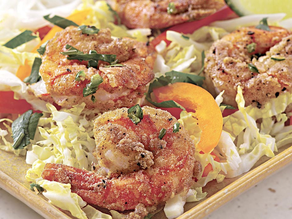 - Combine rice flour, salt, pepper and five-spice powder in a medium bowl. Add shrimp and toss to coat in spice mixture. Heat oil in a large nonstick skillet over medium-high heat. Add the shrimp and cook, stirring often, until pink and curled, 3 to 4 minutes. Add jalapenos and cook until the shrimp are cooked through, about 1 minute more. Serve the slaw topped with the shrimp.