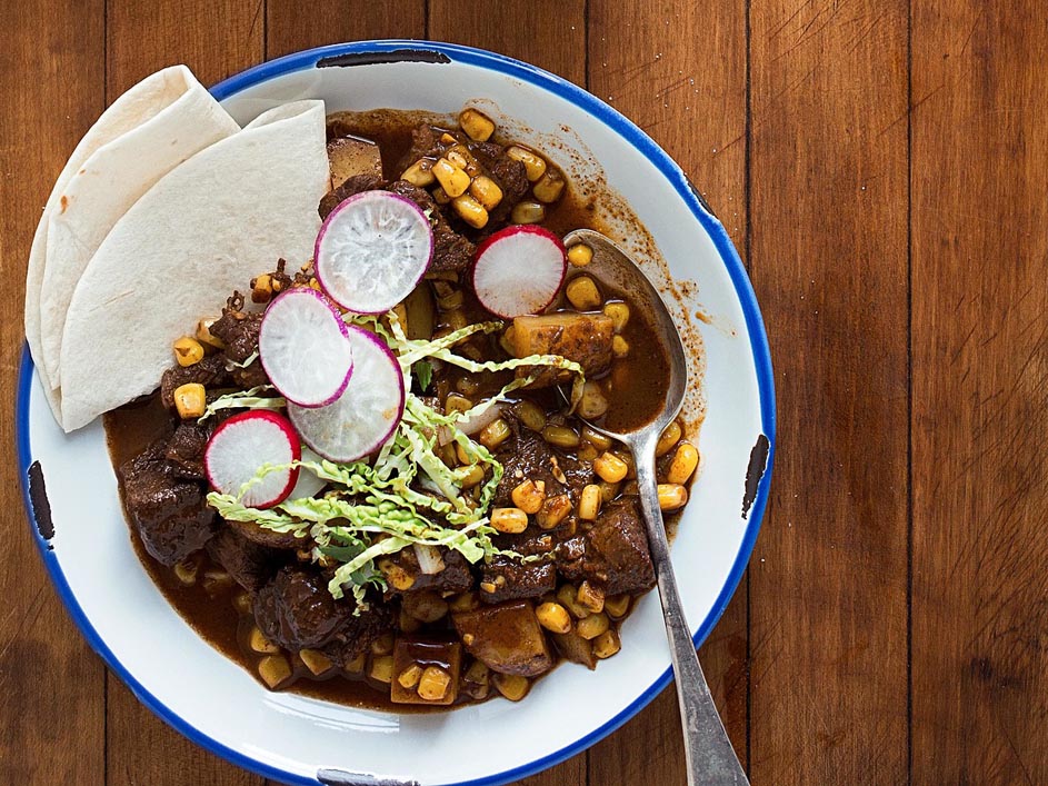 - Serve the chili topped with cabbage, radishes, onion and cilantro, and with flour tortillas, if desired.