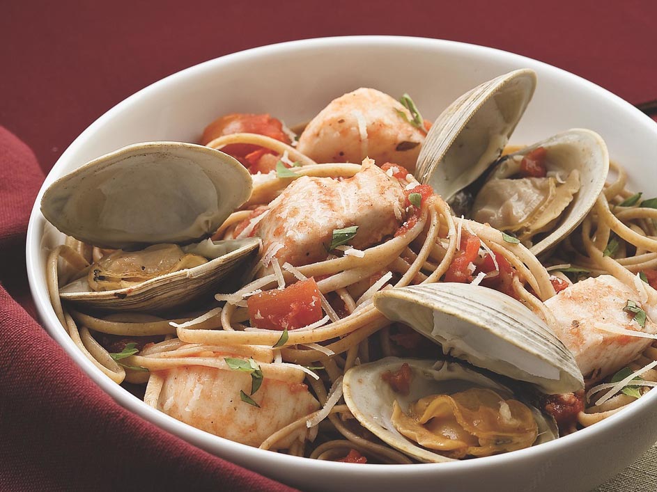 This restaurant-worthy seafood pasta dish is a snap to make and an easy way to impress guests. We like the sweet taste and extra-saucy consistency of canned diced San Marzano tomatoes in sauces like this one. Marjoram pairs well with the seafood, but basil or even parsley works too. Serve with a Caesar salad.