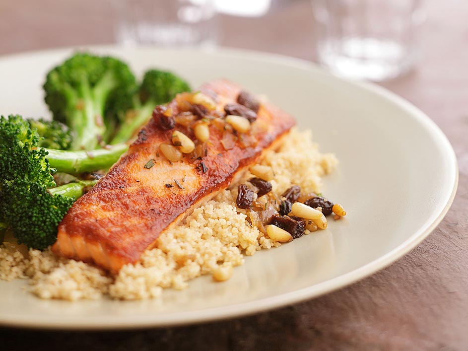 - To serve, divide the broccoli among 4 plates. Top with salmon and spoon raisins, pine nuts and any liquid remaining in the pan over the salmon.