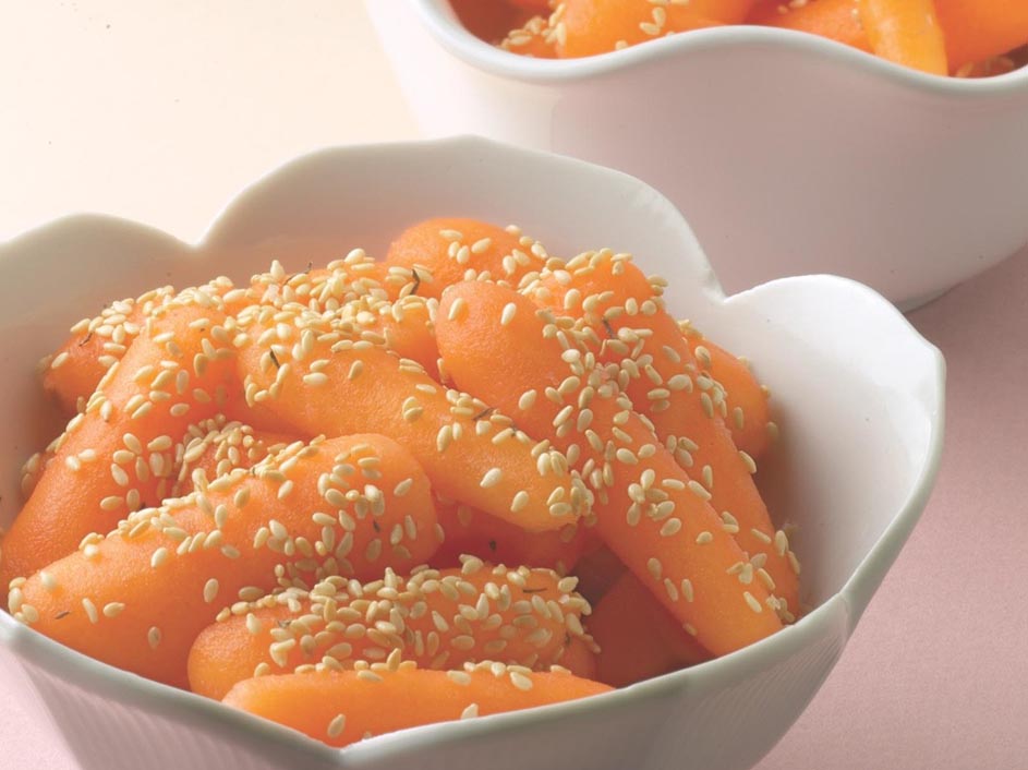 Toasted sesame seeds add taste and eye appeal to a cheery plate of carrots.