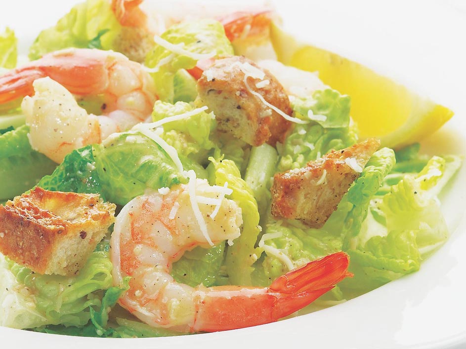 While most Caesars drown the greens in a heavy dressing, this lemony version lets the taste of the shrimp shine through. Don't worry about the anchovies—they'll mellow in the dressing, giving it a rich taste that can't be duplicated.