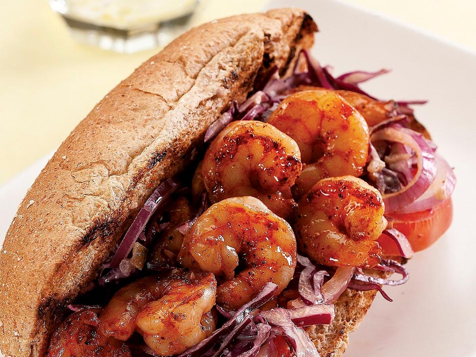 This twist on the Louisiana favorite piles grilled shrimp and creamy-dressed cabbage onto a crusty bun. Bread that’s soft on the inside and crusty on the outside is perfect for a Po’ Boy sandwich. We grill both sides of a whole-wheat bun for that added crunch. You may need a few extra napkins to enjoy it, but this quick and easy sandwich is well worth it. Serve with: Sauteed corn and bell peppers.