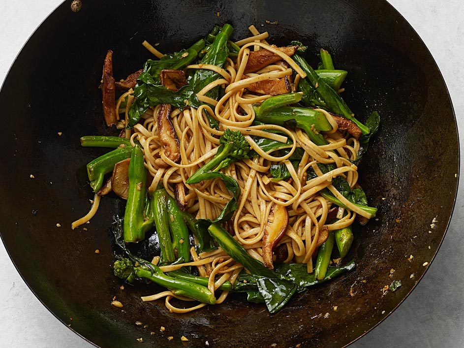 3. Heat a 14-inch flat-bottomed wok or large heavy skillet (not nonstick) over high heat until a bead of water vaporizes within 1 to 2 seconds of contact. Swirl in 1 tablespoon peanut oil, add ginger and garlic and stir-fry until fragrant, about 10 seconds. Add mushrooms and the broccoli (or broccolini) stalks and stir-fry until all the oil is absorbed, about 30 seconds. Swirl in the remaining 1 tablespoon oil and add the noodles and broccoli leaves; stir-fry until just combined, about 15 seconds. Stir the soy sauce mixture and swirl it in. Sprinkle with salt and stir-fry until the noodles are heated through, 1 to 2 minutes.