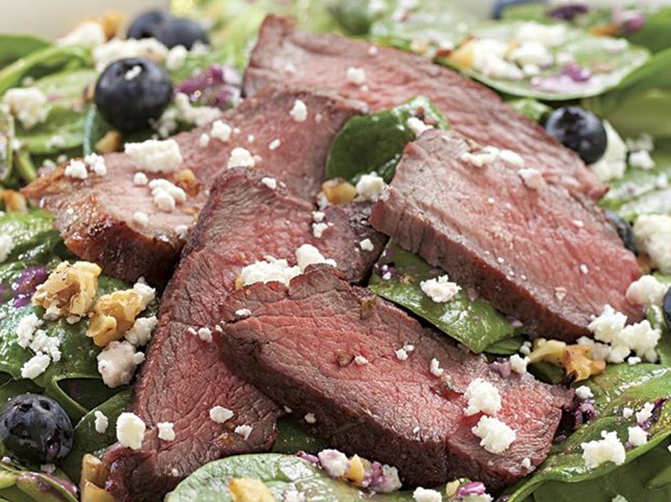 - Add spinach to the bowl with the dressing; toss to coat. Divide the spinach among 4 plates. Thinly slice the steak crosswise. Top the spinach with the steak, feta and the remaining blueberries and walnuts.