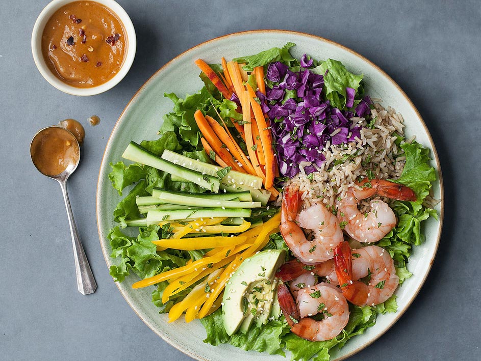 All the tastes, color and fun of a spring roll without all the work! This healthy salad recipe is bursting with the colors of the rainbow from generous amounts of fresh vegetables, shrimp and whole grains all topped with a peanut dressing for the ultimate satisfying salad.