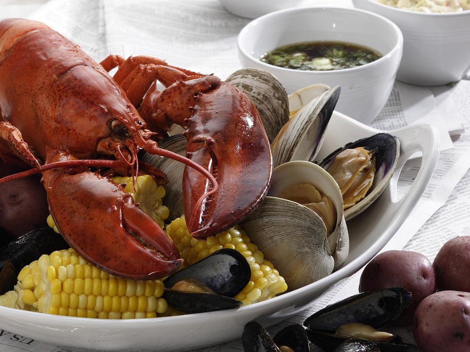 - Place lobsters on top of the potatoes; cover and steam for 4 minutes. Place clams and mussels on top of the lobsters and potatoes; cover and continue steaming for 4 minutes more. Place corn on top of the shellfish; cover and continue steaming until the clams have opened and the potatoes are tender, 4 to 8 minutes more.