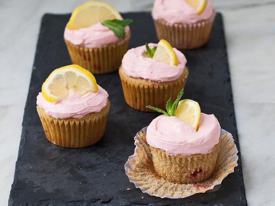 - Frost each cupcake with a generous tablespoon of the cream cheese frosting and top with a mint leaf and lemon slice, if desired.