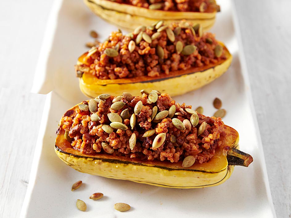 In this Tex-Mex-seasoned stuffed delicata squash recipe we swap out half of the ground beef you’d normally use for bulgur to reduce saturated fat without skimping on the amount of stuffing. Serve with a mixed green salad with cilantro vinaigrette.