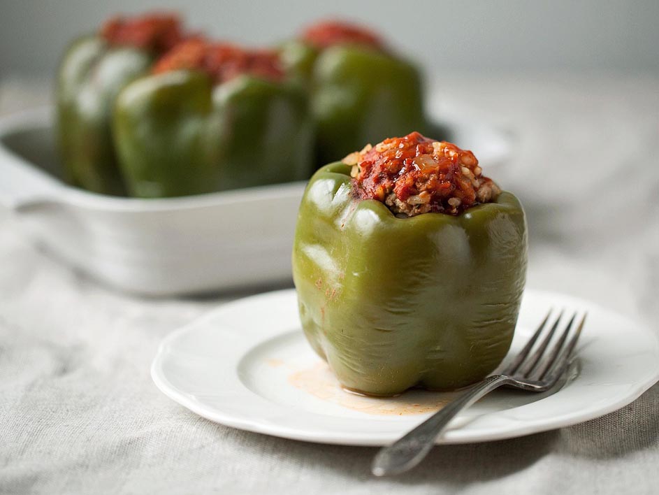 Lean ground turkey makes a moist, low-fat substitute for the ground beef that’s usually found in stuffed pepper filling. To add a nutty flavor and boost the nutrition even further, we call for cooked brown rice, but this recipe will also work with white rice.