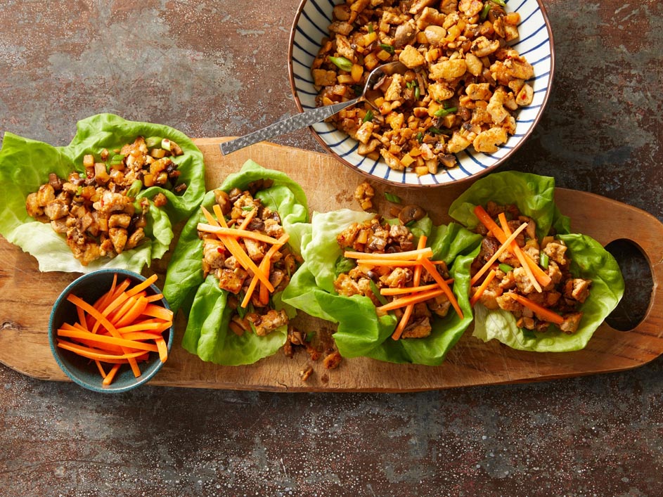Stuff crisp lettuce leaves with a savory filling of tofu, mushrooms and daikon radish for an easy vegetarian dinner that beats takeout! Garnish the wraps with julienned carrots for added crunch.