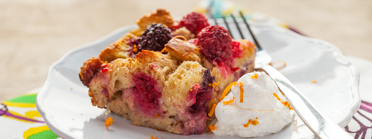 What makes this easy-to-make bread pudding so berry delicious? A tasty medley of mixed berries combined with warm spice notes of orange zest, cinnamon and vanilla.