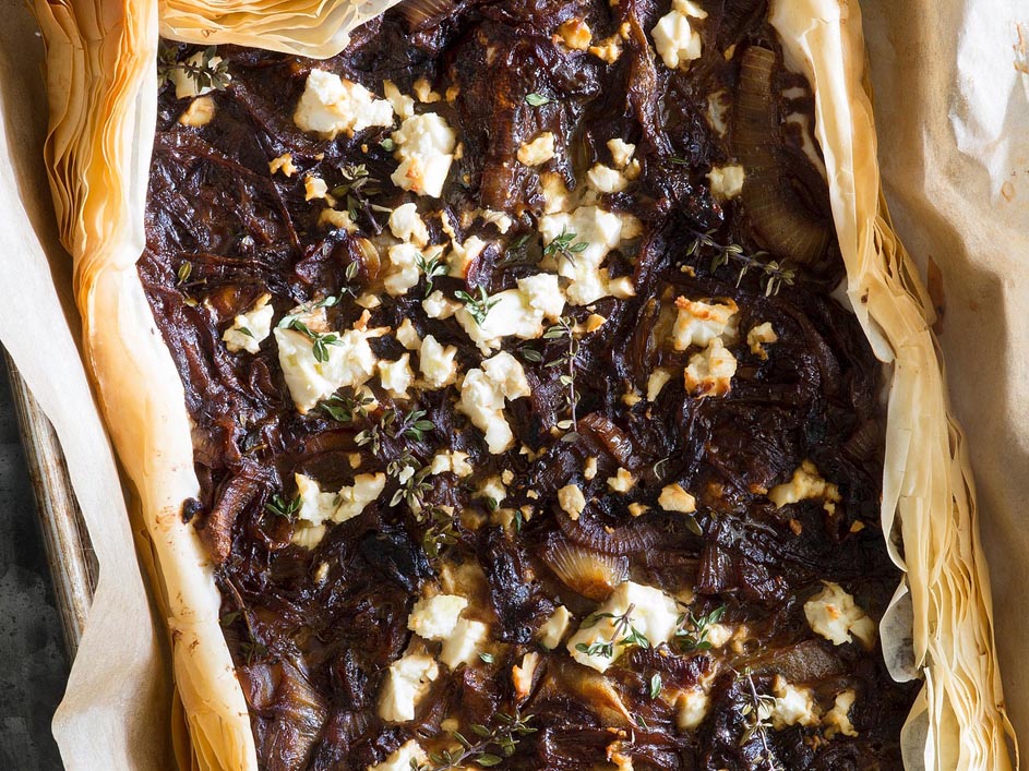 - Spread the onion mixture evenly over the phyllo, leaving a 3/4-inch border around the edges. Carefully roll the edges up to form the outer rim of the tart. Sprinkle with feta and the remaining 1 teaspoon thyme.