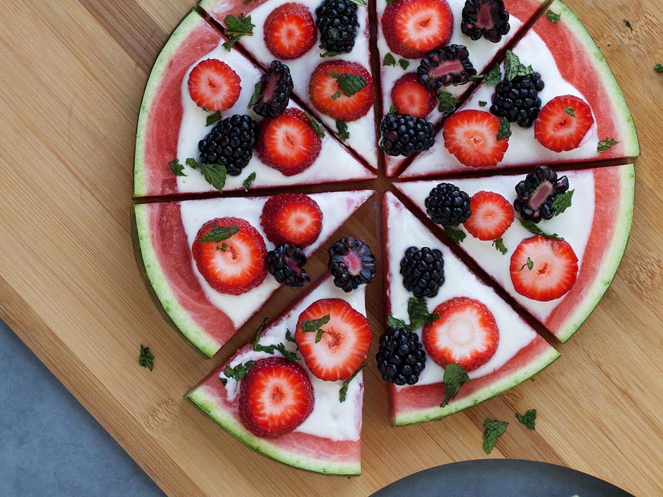 This refreshing fruit dessert pizza recipe swaps classic cookie crust with a healthier watermelon "crust." Topped with yogurt sauce, your favorite berries and mint, this fresh dessert can easily be doubled for a party or halved for every day.