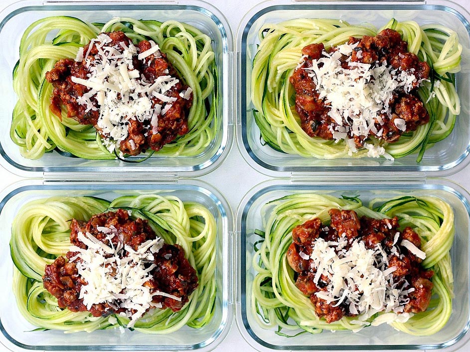 3. As the sauce cooks, divide zucchini noodles among 4 single-serving containers with lids (about 2 cups per container). Add 3/4 cup of the sauce and 2 tablespoons Parmesan to each container. Seal and refrigerate for up to 4 days.